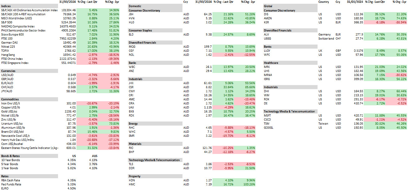 Interest rates remained newsworthy over the quarter with Central Banks around the world, led by the US Federal Reserve, talking down the number of future rate reductions. The Federal Open Market Committee (FOMC) held the Fed Funds rate steady at 5.25-5.50 percent, while projecting 0.75 percent cuts by the end of the year. The latest statement from the FOMC repeated that it is watching for greater confidence that inflation is sustainably moderating toward its 2% target before reducing rates.