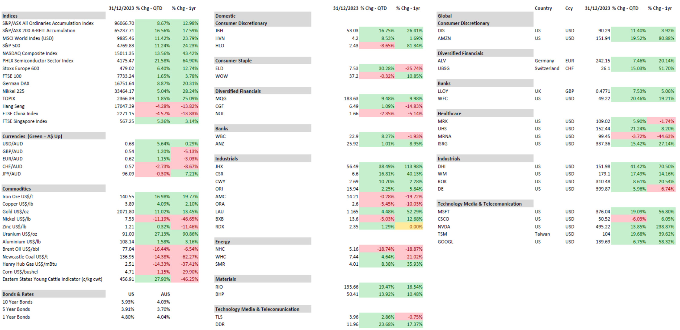 Interest rates rose during the year with the RBA raising short-term rates from 3.10% at the beginning of the year to 4.35%. The Australian 10 Year Bond yield rose slightly from 3.73% to 3.96%; the difference reflected a change in market views on the direction of interest rates during the year. At the beginning of the year central banks made hawkish comments about staying the course until inflation was beaten, but by the end of the year the rhetoric had softened. Importantly, the Federal Reserve signalled reductions in 2024, although it is by no means certain that this will occur early in the year, as seems to be the market’s current view. We anticipate that other developed country central banks will follow but not necessarily with the same timing. Inflationary fears have moderated over the last twelve months and are now approaching central bank target levels.