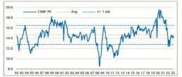 Switching now to broad market valuations, given we are sitting at the start of the new fiscal year, we observe the price earnings multiple for the ASX200 as a whole is approximately in line with long term average levels – 14.5x prospective (FY24) earnings.