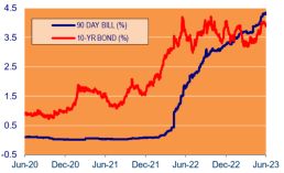 Short term interest rates increased during the quarter, after the banking issues of March, and central banks have indicated that the “pause” is likely to be temporary. Longer term bond yields however are at the same level they were a year ago and have been in within a band of about half a percent for over a year.